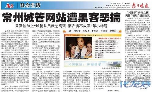 5月29日晚,常州市民吴先生无意中在政府网站上打开该市城市管理局网站的时候,发现一些让他大跌眼镜的内容。在该网站的首页上,竟然有一条大标题写着:“城管队员按摩女 河蟹一家齐欢乐”。下面则是一排类似内容的小标题:“城管队员深入实践,集体视察洗头房”;“城管队员深入实践,集体殴打小贩”;“城管队员武艺高强,菜农溃不成军”等。但点击后 ,里面并没有其他恶意内容,有的则是一幅情色图片:一男子衣衫不整搂着两个浓妆的女子,周围栏目里充斥着和首页上大致一样的诽谤内容。网站上的内容先是让吴先生吓了一大跳,不过随后想到,“这个网站肯定是被黑了”。
