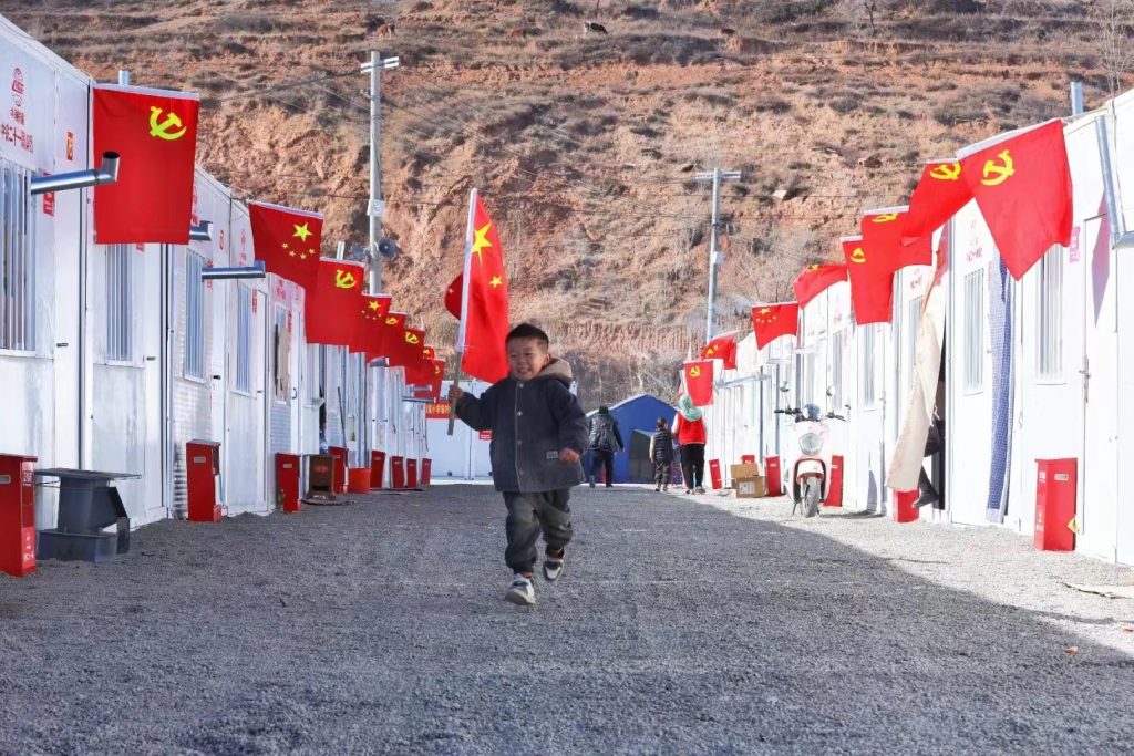孩子手举国企微笑奔跑,背景中国旗与党旗交相辉印。