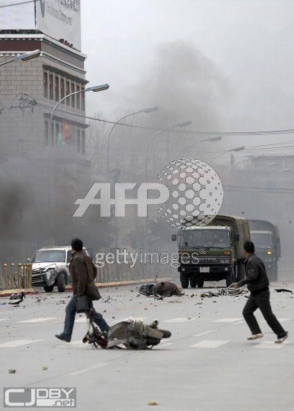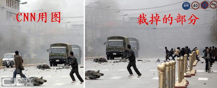 显然,如果只看报道而不看原图,则只能给人“军队进驻拉萨镇压”的感觉,而看不到图右边的暴徒。下面这张是一位消防员被打倒的图片,西方媒体没有报道。