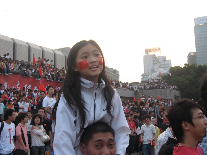 5月11日,北京奥运火炬传递现场,一位父亲将女儿托在肩膀,等待奥运火炬的到来,小女孩的目光中充满了期待。